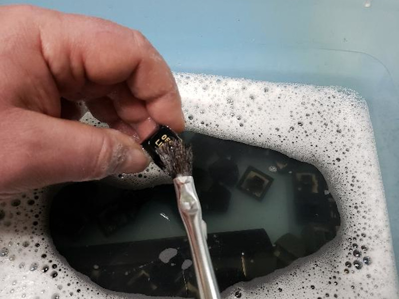 Cleaning keycaps from a Heathkit H-19 terminal. Though we work with some of the most complex computers ever designed, not all of the work is technical. An LSSM technician got a nasty case of dishpan hands working on this keyboard, but the result is a mid-1970s video terminal that looks like new!
