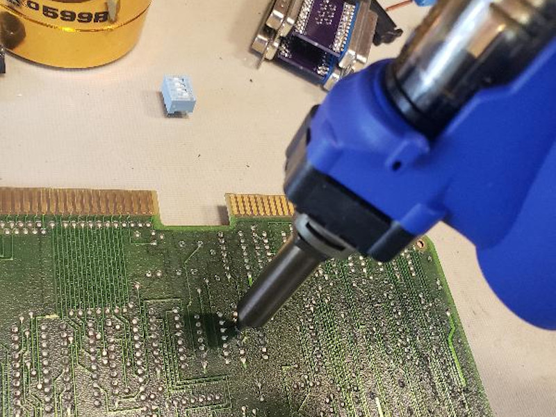 Repair of a serial I/O board in a DEC PDP-8/e. Since some of our systems are large and difficult to move, sometimes repairs are made right on the exhibit floor.