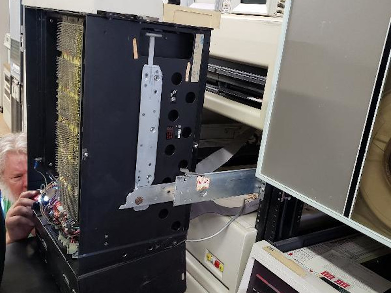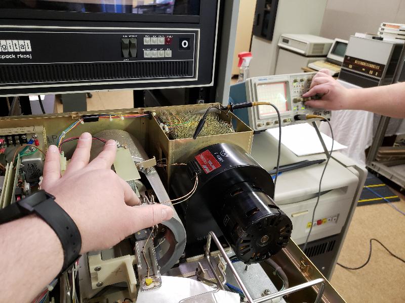 LSSM technician performing a head servo adjustment on DEC RK05 disk drive. Adjustments like this are complex and sensitive, but this equipment is well-documented, and our experienced team is comfortable with this type of maintenance. Most of us really enjoy this type of work; it's just like a car nut giving a classic Corvette a tune-up. The same passions, for the same reasons.