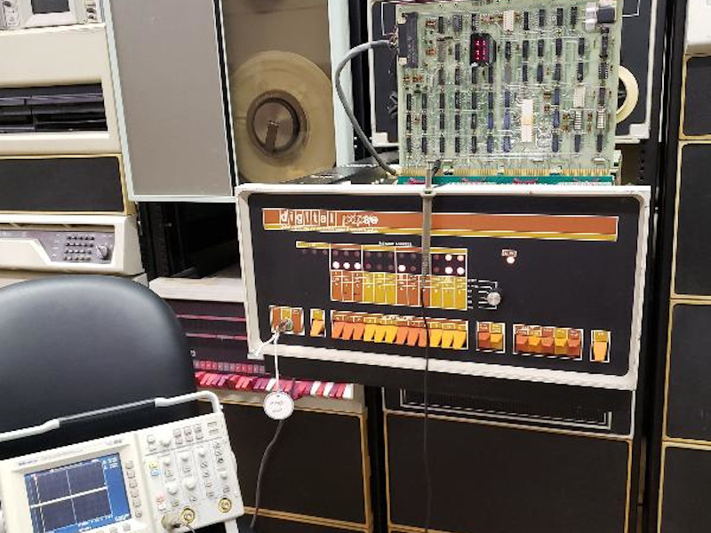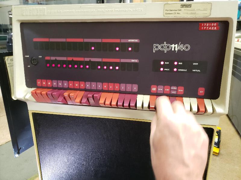 This DEC PDP-11/40 minicomputer, built in 1974, came to us from the University of Pittsburgh. It had been sitting in storage for many years, and needed quite a bit of work to come back to life. We rebuilt its power supply, replaced several failed ribbon cables, and performed some minor repairs.