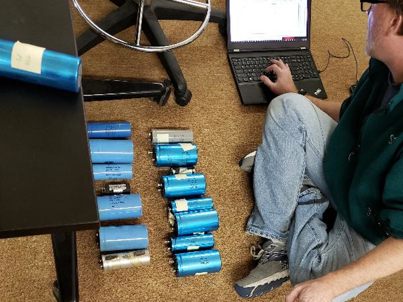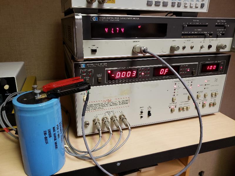 Capacitor triage in a DEC RP06 (Memorex 677-01) disk drive. These large capacitors are frequent failure items, and they are expensive to replace. Fortunately we have the proper lab instruments to test them, so that we end up replacing them only when necessary.